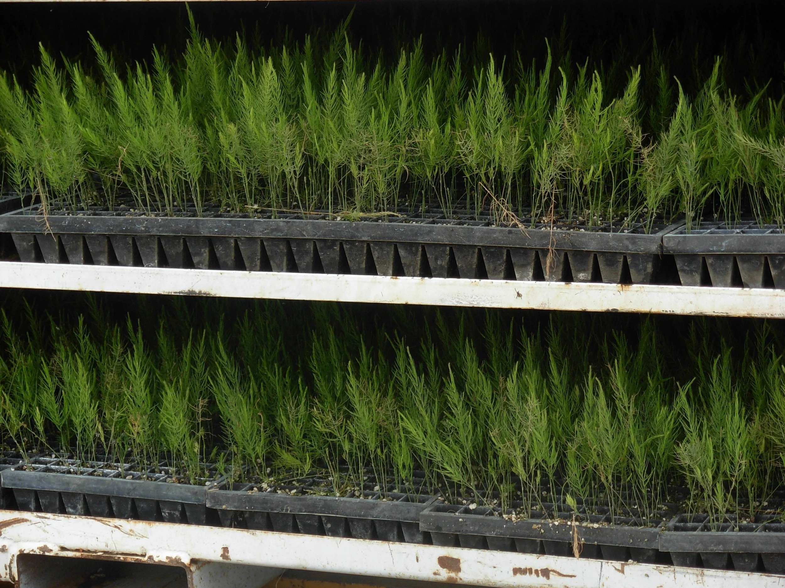 Letβs start at the very beginning: planting. There are three ways by which you can plant asparagus: seeds, transplants, and crowns. The crown is a one year old root structure, similar to a tuber or a bulb. Crowns are what you would commonly find in gardening catalogues and nurseries. It is how youβd typically plant for a home garden. On our farm we use transplants, not crowns. Crowns are too expensive for large acreages, in adition to being difficult and costly to plant. The transplants are started from seed in a greenhouse, delivered to our farm in trays with about 300 plants each, and planted into our fields using the help of a mechanical transplanter in the spring.