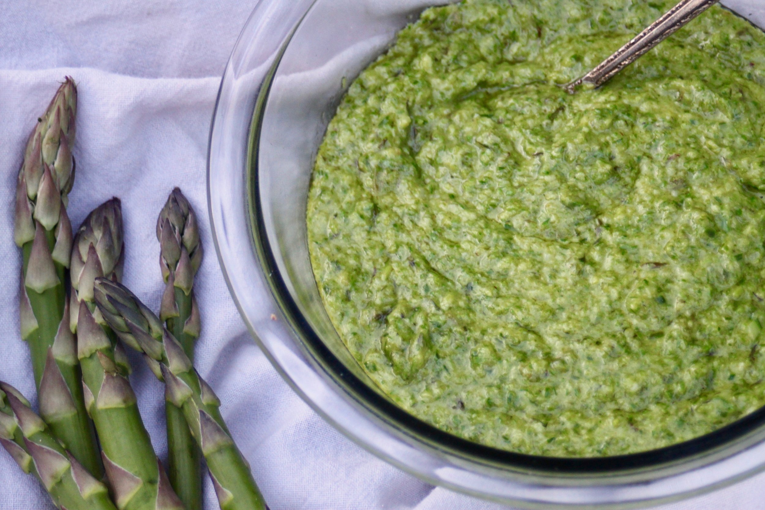 A simple sauce of asparagus, garlic, olive oil has endless uses!