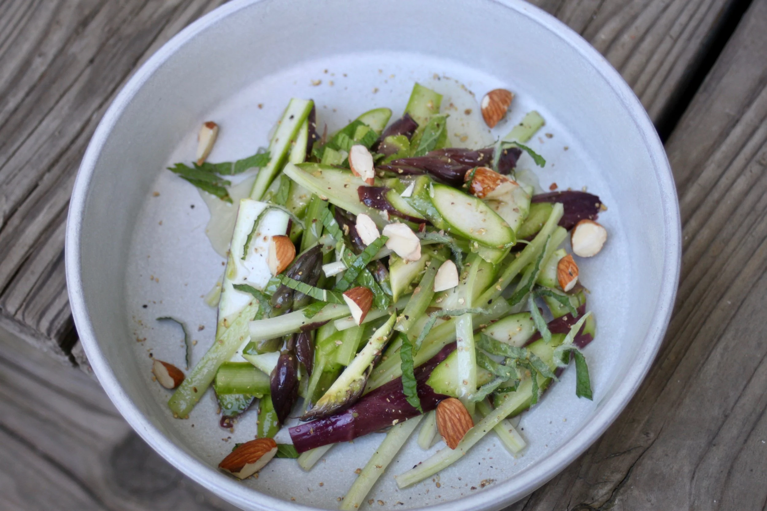 So, that brings us back to this recipe: both the celery and asparagus are kept raw (we love a good raw asparagus salad), sliced thinly, and dressed minimally. Their flavors are enhanced by the sweetness of the raw almonds and mint, and brightened with a shower of lemon juice. I used Meyer lemons, which I would strongly recommend (another seasonal treat in our area right now!).